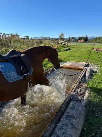 Nun kann das gerittene Training beginnen. Auch hier sollte auf das Ziel, den Parcours mittels minimaler Hilfen zu durchreiten, hingearbeitet werden: Die Einwirkungen des Reiters auf sein Pferd sollten sich auf Gewichts- und Schenkelhilfen (je geringer desto besser) beschränken; im Bereich der Zügelhilfen bestimmen lange Zügel das Idealbild. Lose Zügel geben dem Pferd die nötige Kopffreiheit sich seinen Weg durch und über ein Hindernis selbst zu suchen.